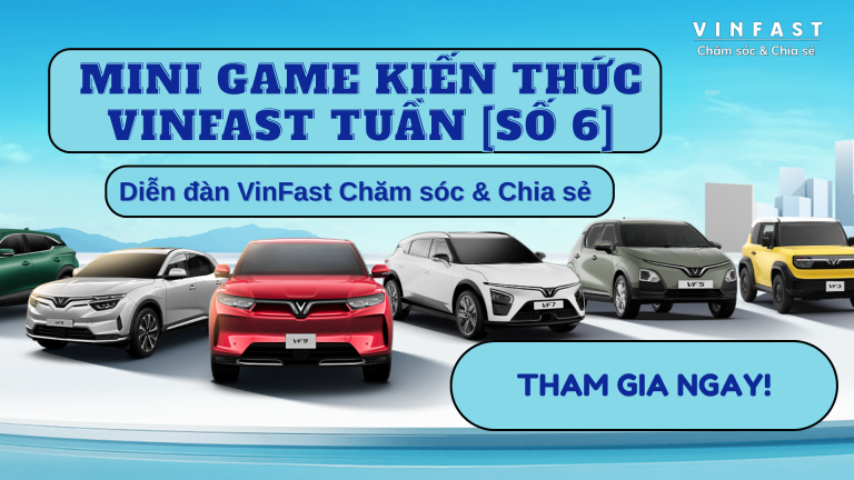 Diễn đàn VinFast Chăm sóc & Chia sẻ tạo sân chơi kiến thức về xe ô tô điện VinFast, nơi các thành viên có dịp trổ tài hiểu biết và học hỏi thêm kinh nghiệm. Đối tượng tham gia: √ Thành viên Diễn đàn VinFast Chăm sóc & Chia sẻ. √ Toàn thể khách hàng quan tâm đến xe điện VinFast. Thời gian: Từ nay đến 12h00 (trưa) ngày [03/11/2025] Cách tham gia: √ Trả lời 10 câu hỏi trong chủ đề “Mini game kiến thức VinFast tuần số [Số 6]” ngay bên dưới. √ (Lưu ý: Vui lòng dùng trình duyệt trên PC/Mobile, hiện tạm chưa hiển thị trên VinFast App). √ Trở thành cao thủ kiến thức VinFast khi trả lời đúng 10/10 câu với thời gian ngắn nhất! Công bố kết quả: √ Top 3 thành viên trả lời đúng và nhanh nhất sẽ được vinh danh vào sáng Thứ Hai hàng tuần. √ Thành viên xuất sắc sẽ được gắn tag đặc biệt: “Thành viên xuất sắc tuần [số 6]” trong bài công bố kết quả. √ Mọi thành tích của chủ xe sẽ được lưu lại để làm cơ sở xét chọn ưu tiên tham