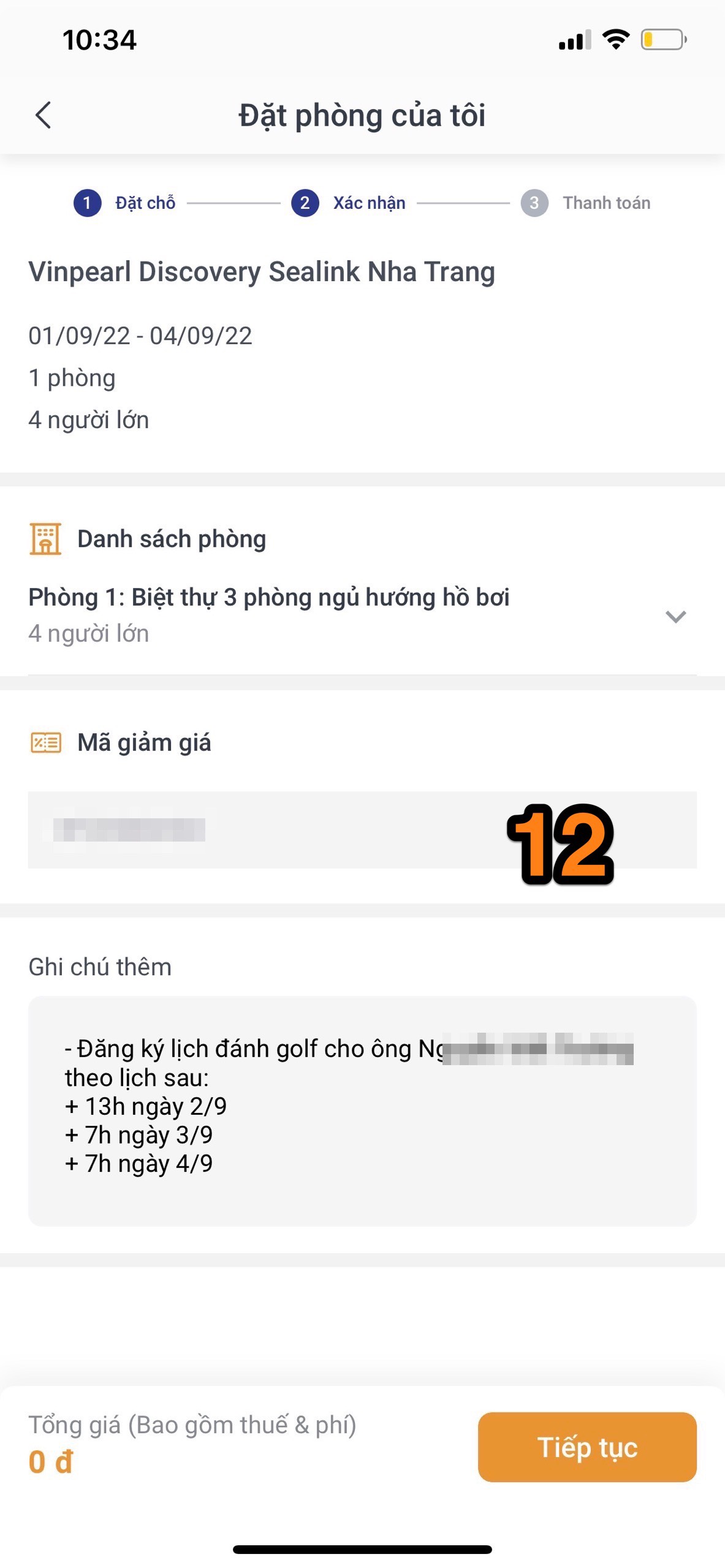 Bước 12: Bước quan trọng nhất nha các bác. Bước này các bác cần check kỹ lại các thông tin xem chuẩn chưa nhé. Để cẩn thận hơn thì đặt phòng trước rồi hẵng đặt vé máy bay ạ. Và quan trọng nhất ở phần ghi chú (các bác nêu rõ danh sách đoàn – họ tên đầy đủ, ngày tháng năm sinh với trẻ em, số hiệu chuyến bay đón tiễn, các lưu ý khác như đổi bữa trưa sang ăn trưa ngày đầu tiên,…) nếu không nhập vào phần ghi chú này đủ thông tin thì lúc Vinpearl gửi email xác nhận cũng sẽ yêu cầu tuy nhiên e kiến nghị nên điền ít nhất đầy đủ danh sách đoàn và ngày sinh trẻ em. (Ảnh 12)