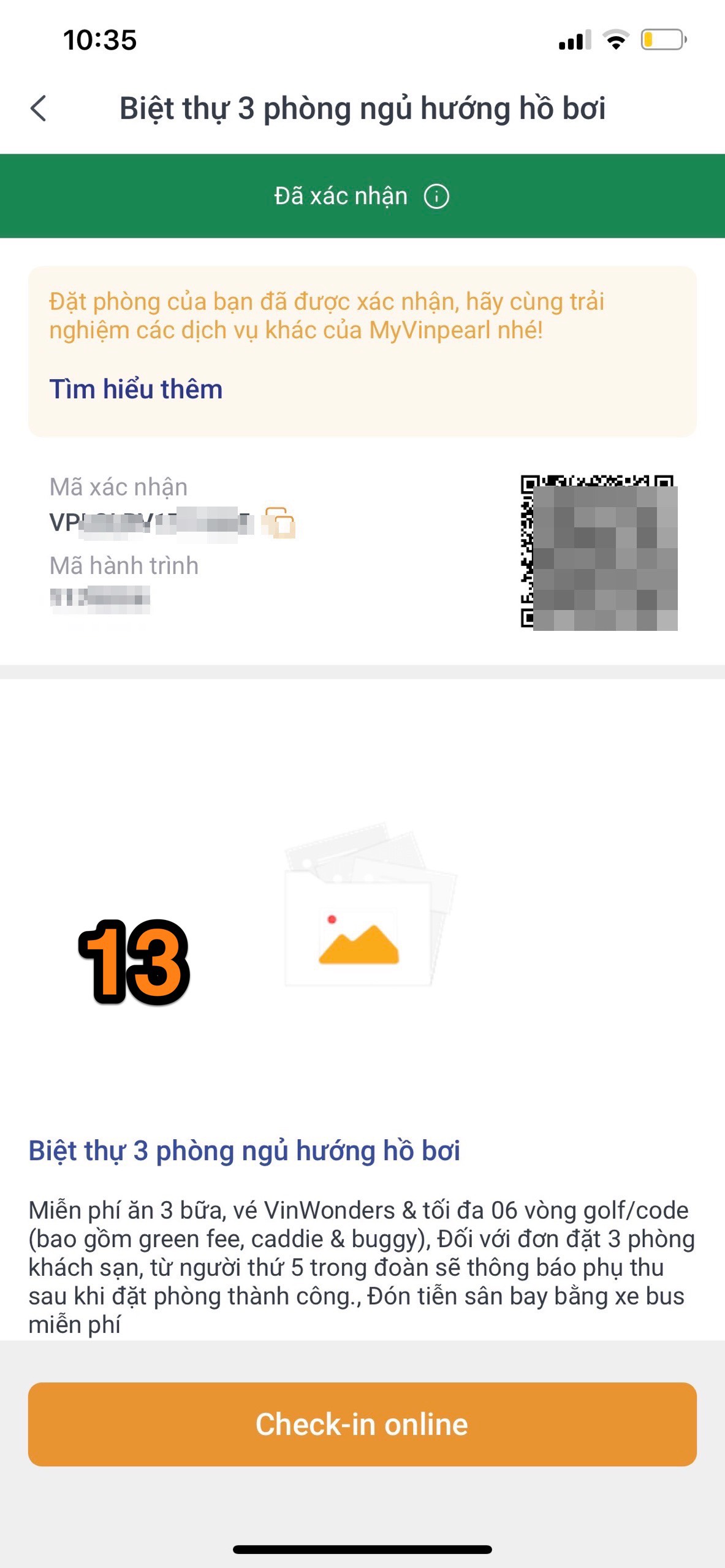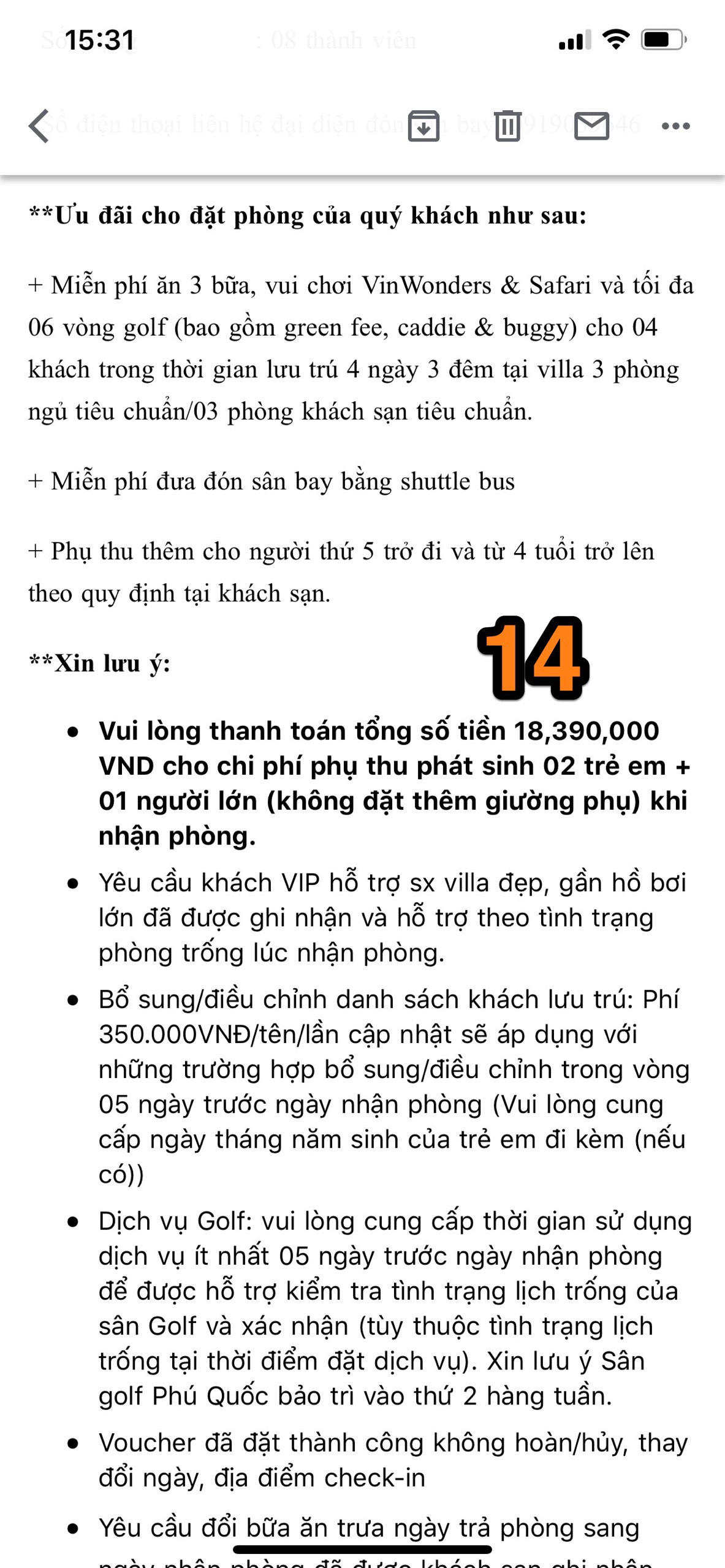 Bác nào đang có voucher trong tay có thể check thử, phụ thu người lớn và phụ thu trẻ em trên app đang tính bằng nhau (có thể do sai sót của app). Cụ thể là Phú Quốc phụ thu người lớn và trẻ em thứ nhất đều đang tính 3.030.000VNĐ/người. Vì vậy để được tính giá phụ thu đúng số tiền thì các bác chỉ chọn 4 người lớn thôi. Và note vào phần ghi chú ở bước thứ 13 danh sách đoàn của mình. Sau khi hoàn tất đặt phòng Vinpearl sẽ email báo với các bác phụ thu chính xác (Ảnh 14). Lúc đó mình mới thanh toán.