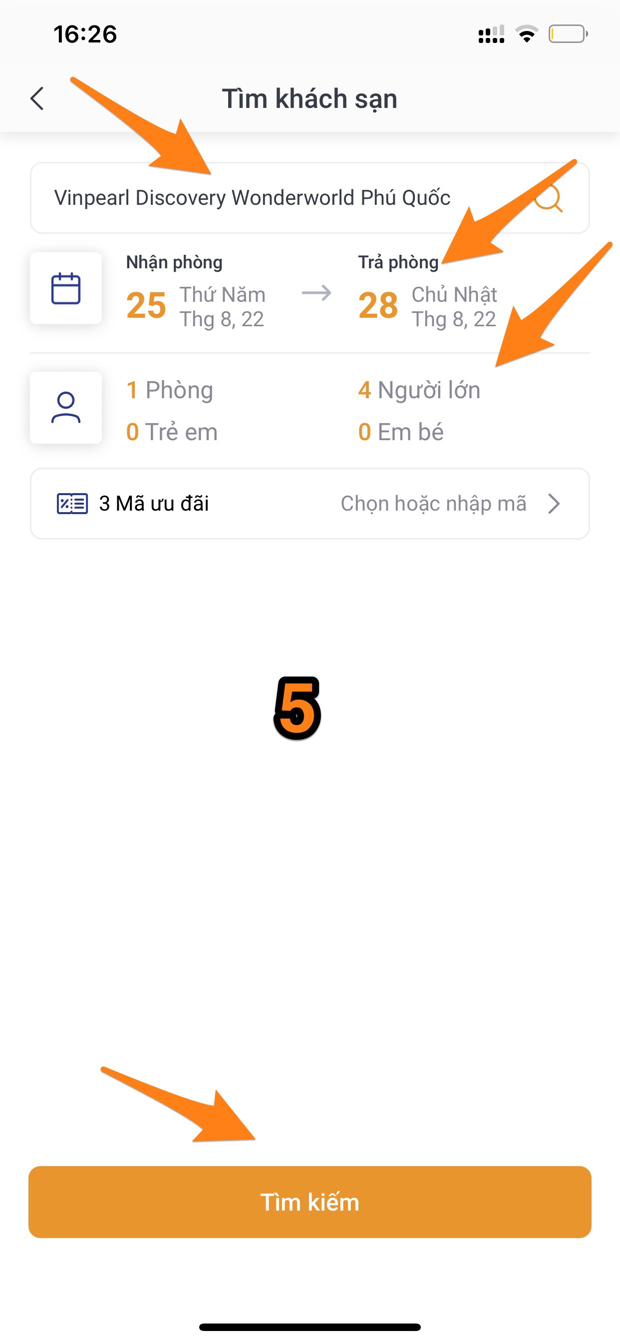 Bước 5: Chọn khu mong muốn (có tất cả 13 khu tại Nha Trang, Phú Quốc, Hạ Long, Hội An-Đà Nẵng), chọn giai đoạn mong muốn (như em biết lễ 2/9 chỉ phụ thu tại Hạ Long còn các khu khác không bị phụ thu), chọn số lượng người các bác chọn 4 NGƯỜI LỚN thôi nha (bước này mới hay ho nè, e sẽ ví dụ em cần đặt cho 5 người lớn + 2 trẻ em + 1 em bé nhé) (Ảnh 5)