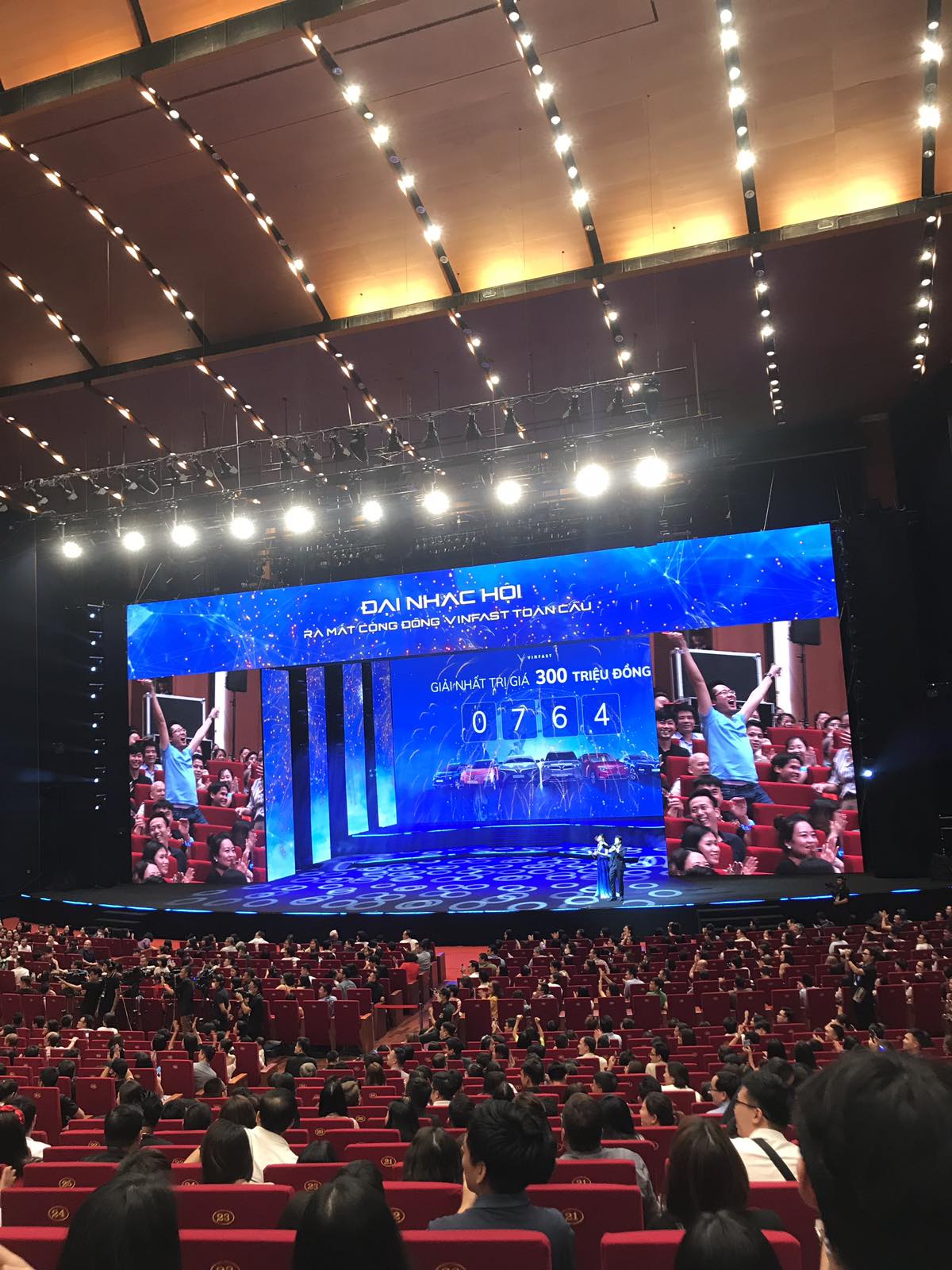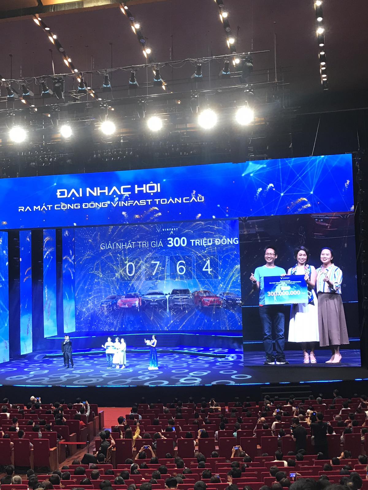 Đại diện VinFast, ông Hoàng Chí Trung – Tổng giám đốc VinFast Trading Việt Nam và ông Trần Lê Phương – Phó Tổng giám đốc đối ngoại VinFast lên trao giải cho người may mắn. Khách hàng nhận thưởng giải nhất đã quyết định gửi tặng đồng bào miền Trung 100 triệu đồng. Bác tốt bụng quá.
