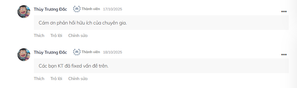 Chia sẻ trên diễn đàn sau đó, anh Thùy bày tỏ: “Cám ơn phản hồi hữu ích của chuyên gia. Các bạn kỹ thuật đã khắc phục được vấn đề.”