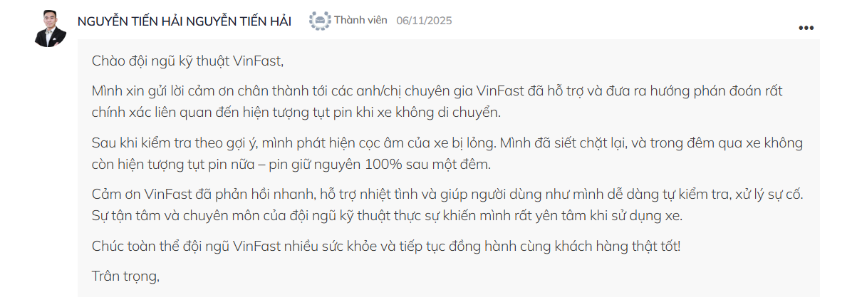 Anh Hải làm theo hướng dẫn và phát hiện cọc âm 12V bị lỏng, anh siết lại cọc âm 12V; qua đêm SOC giữ nguyên 100%. Hiện tượng giảm pin khi đỗ chấm dứt. Gửi lời cảm ơn trên diễn đàn, anh viết: “Mình xin gửi lời cảm ơn chân thành tới các anh/chị chuyên gia VinFast đã hỗ trợ và đưa ra hướng phán đoán rất chính xác liên quan đến hiện tượng tụt pin khi xe không di chuyển. Sau khi kiểm tra theo gợi ý, mình phát hiện cọc âm của xe bị lỏng. Mình đã siết chặt lại, và trong đêm qua xe không còn hiện tượng tụt pin nữa.”
