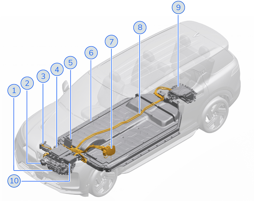 Hệ thống điện áp cao trên VinFast VF 9 bao gồm nhiều bộ phận liên kết chặt chẽ với nhau, cụ thể: