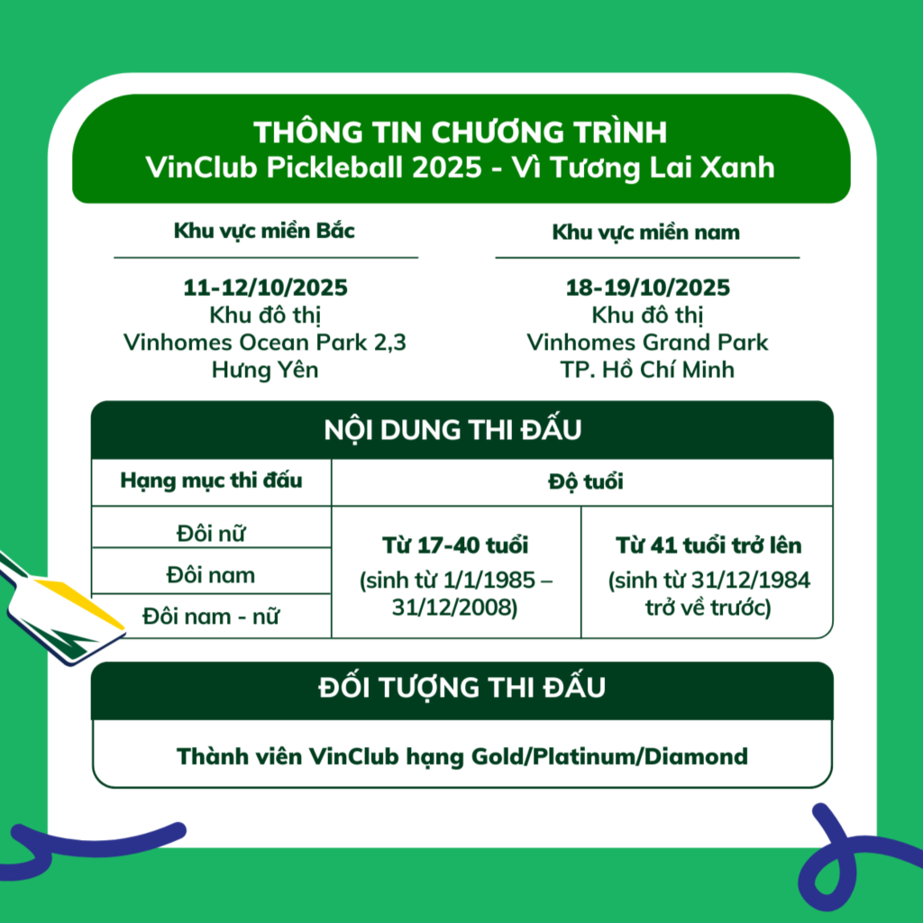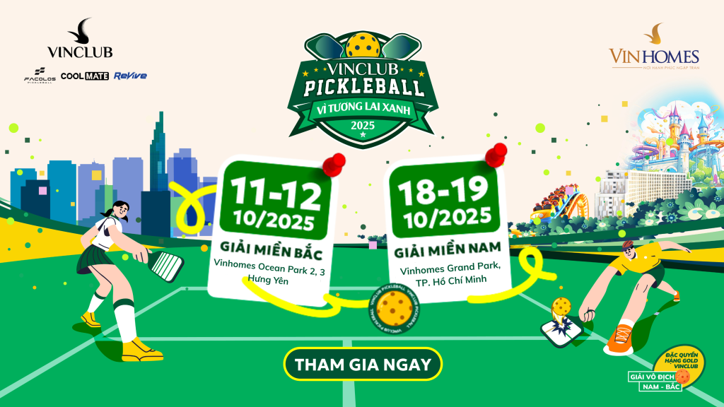 Với mục tiêu nâng cao tinh thần sống khỏe – sống xanh, lan tỏa các giá trị sống xanh đến cộng đồng thành viên, VinClub trân trọng công bố giải thể thao VinClub Pickleball 2025 – Vì Tương Lai Xanh. Đây là sự kiện ý nghĩa và là sân chơi thể thao đẳng cấp được tổ chức độc quyền dành cho thành viên từ hạng Gold VinClub với hơn 450 vận động viên và dự kiến thu hút hơn 4.000 khán giả tham dự.
